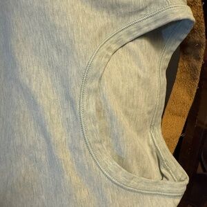 Lululemon men’s small mint green T-shirt, no tags, but I have several of these and definitely am men small and I think mostly cotton. I put the chest measurements in a photo. This is well worn and well loved, but no stains. You can see the stitching is tight. No holes or frays