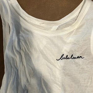 EUC Lululemon logo all tied up tank size 4. This tank is amazing and great for custom fit! Wrinkled from being in my summer clothes bin but no stains rips or tears! White with black cursive logo and white logo on hip!