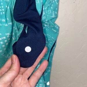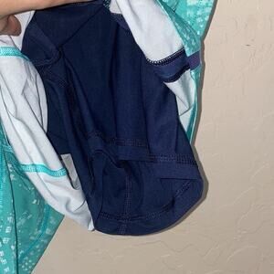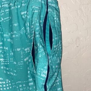 9” inseam. Lined with blue spandex. Drawstring waist