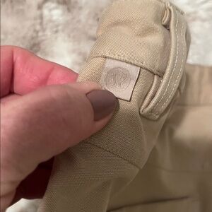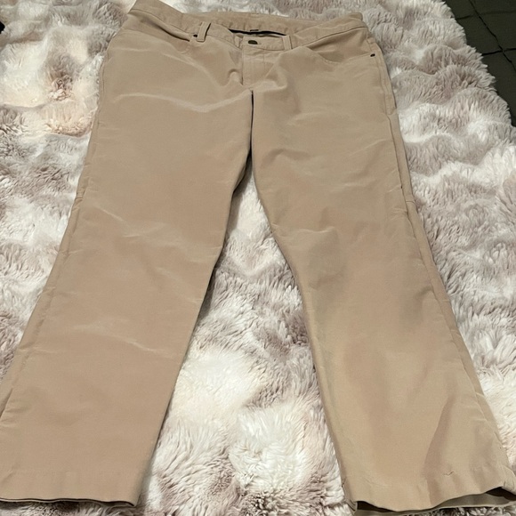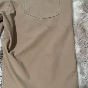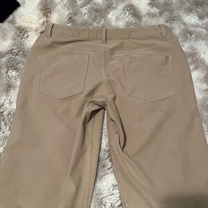 Tan lululemon pants. Inseam is right at 31. Waist 33. See last photo for light stain on back of leg.