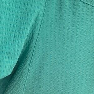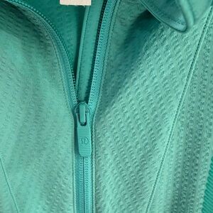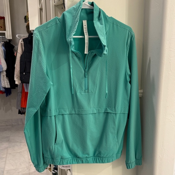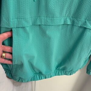 Lululemon women’s windbreaker like pullover- nightwear textured material- front zip- pocket in front goes from side to side with no zippers- as shown can pack into itself for easy travel … size 4- green