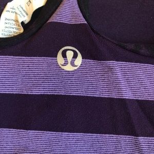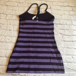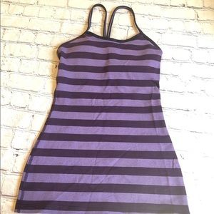 Classic power Y tank from lululemon athletica with purple stripes, contrast trim/straps and built in shelf bra with removable pads. Size 2