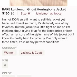 Lululemon rare be present jacket in ghost herringbone in size 6. Gently worn four times and nearly In brand new perfect condition. Inside tag has been removed and mostly that’s it. Super soft and stretchy! Didn’t really want to give this away but it’s now a bit to tight on me