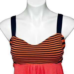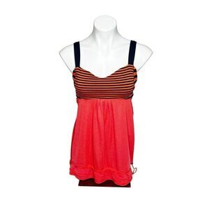 Lululemon run back on track tank light flare/ inkwell stripe size 10. Coral and navy blue colors. Drawstring bottom. One tiny snag in the front (see photos). No padded inserts. Length 26” Chest 14”.