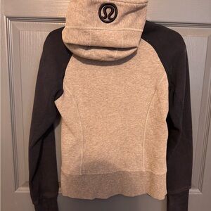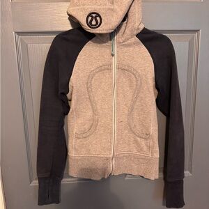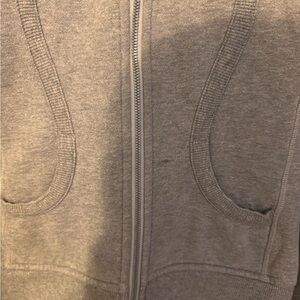 Stylish gray and black zip-up hoodie with a front zipper and hood. Lululemon scuba. Size 4. Used but good condition. Heavy cotton material. Small mark on the front of the hoodie (pictured)