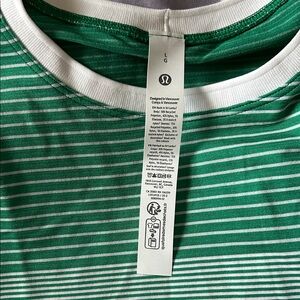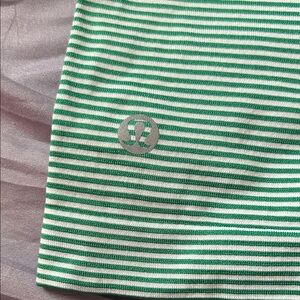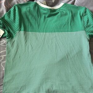 Lululemon green striped t-shirt with a white collar. Casual and stylish.