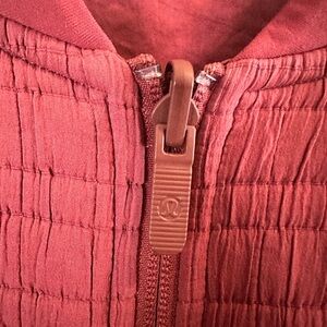 Elevate your wardrobe with this elegant maroon quilted bomber jacket. Perfect for any occasion, it combines style and comfort effortlessly.-I cut tag out but you can see the Lululemon zippers along with emblem on both sides. Additional size tag located in pocket as pictured.