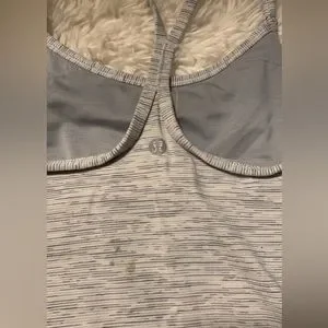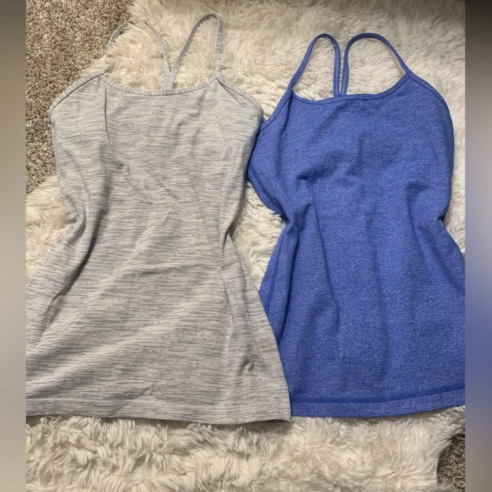 Set of 2 lululemon racer back workout tops. Blue one is in perfect condition and the striped one has a very small stain on the back (pictured) both are size 4