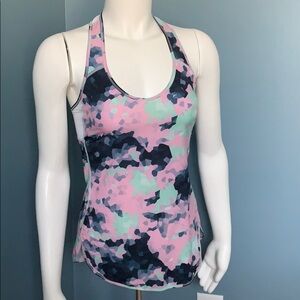 Lululemon heart opening yoga halter pink porcelain Taryn Toomey. Shelf bra. Ruched back. No size tag. Pit to pit 13. Shoulder to hem 21.