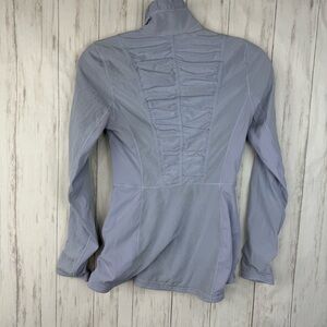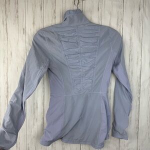 Lululemon size 4 Light Gray Periwinkle Jacket. Gently preloved in great condition. Soft lining inside. Flattering fit. Great for hiking and the gym