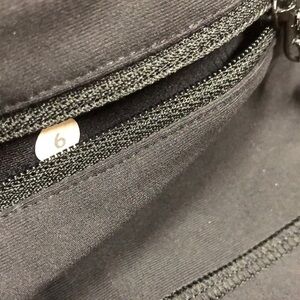 Scalloped hem; back zipper storage compartment; 2 front interior storage pockets