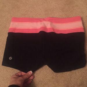 Size 6 lululemon shorts. Tag is ripped out, but they were only worn 5-6 times. I have had them for about a year and a half. In very good condition and very cute. Will also sell a Lululemon bag with it:))