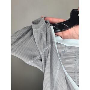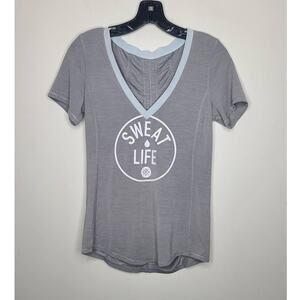 Lululemon ‘Sweat Life’ shirt in gently used condition, ruching up the back, size tag is missing but measures close to a size 2 or 4 - please check measurements
