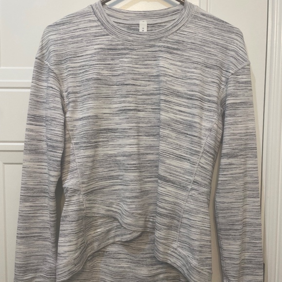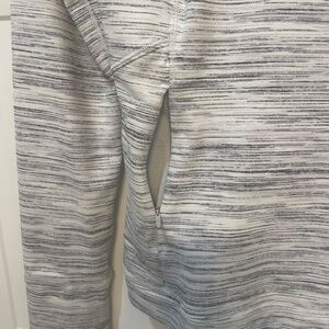 Size M. Grey and white. Sleeves have thumb hole. Small zipper pocket.