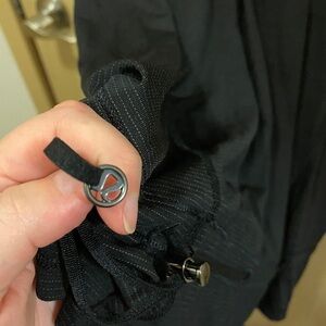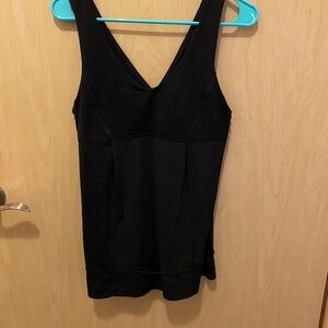 I can’t find a size dot on this so please see pictures for measurements. Thinking it’s a small/medium in good condition this tank top is solid black on the top with stripes going down on the bottom half.