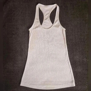 This like new Lululemon tank top, is in excellent pre-owned condition and is very light blue in color. The size tag was removed for comfort purposes, so please see measurements, but I believe it is either a 4 or 6.