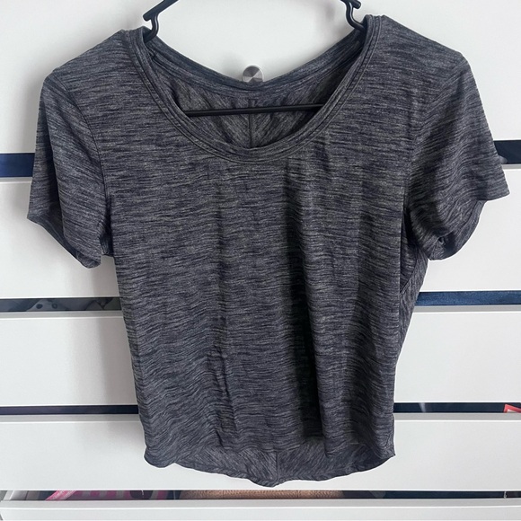 EUC heathered black lululemon short sleeve tee with drapey back, no size tag but is a 4