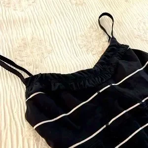 Vintage Lulu in excellent condition! Built in bra for this extra long, black with small white stripes top. Bottom hem has a drawstring to cinch close if preferred. Top hem has black ruffle detail and adjustable straps! Women’s size 4.