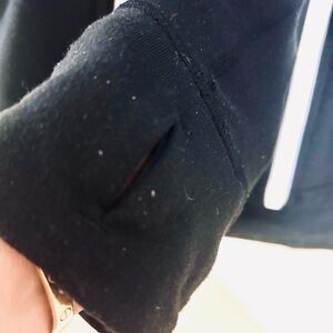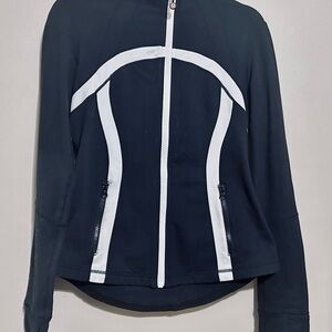 vintage Lululemon track jacket, features a high mandarin collar and distinctive white contrast trim against a black body. These styles are popular in the resale market for their classic, form-Full-zip front with a contrast white zipper and a signature red/orange "omega" logo zipper pull. Typically identified as a "Shape Jacket" or similar vintage athletic track jacket. It has pilling regular wear.