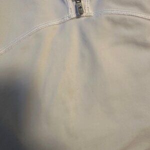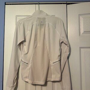 Lululemon white long sleeve zip top. 2 zipper pockets. Thumb holes in sleeves. Lululemon logo on back. Barely visible stain on front of shirt in last photo, otherwise perfect condition. Size 10