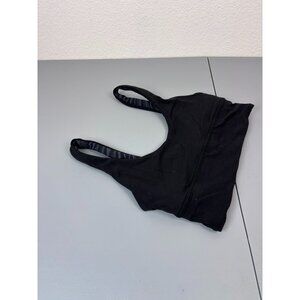 Lululemon brand women's size 4 black/Le Tigre Camo deep coal multi Align reversible bra. In great pre-owned condition. Soft material with a great stretch and a wide band. Reversible top can be worn both ways. Low support, fits A/B cups. Unlined and wireless. Band measures 12" across laying flat.