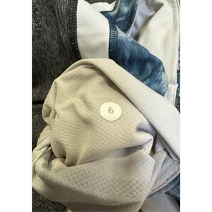 Lululemon women’s gray leggings with blue/white waistband zipper pockets & mesh strips on legs, size 6/28