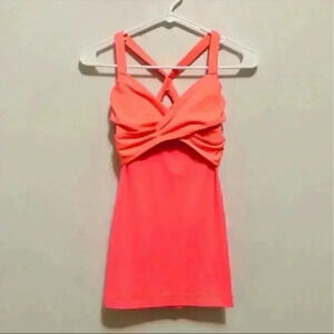 Lululemon wrap it up coral color tank top with a built in bra. The bra has padding. Does not have a size but it measures as a 4.