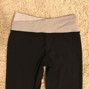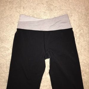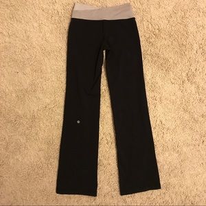 Black Lululemon yoga pants with a purple and gray waistband. In excellent condition, worn very limited times. Size tag was cut out, but they are a 6. Never dried in machine, only hung on dry rack. Inside pocket on the back; great pants!
