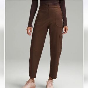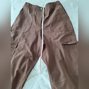 Lululemon 29 Brown Barrel cargo pants, front pockets, side pocket, elastic waist, zipper fly, twill cotton blend. 39" long, 14.5" rise, 26" inseam.