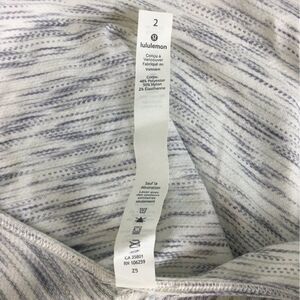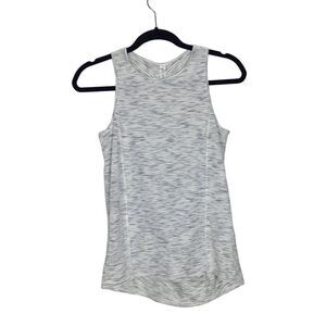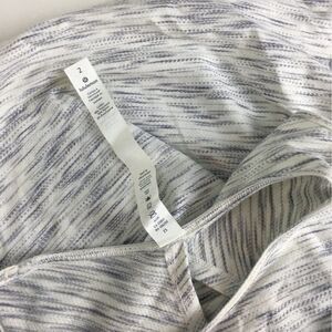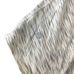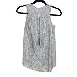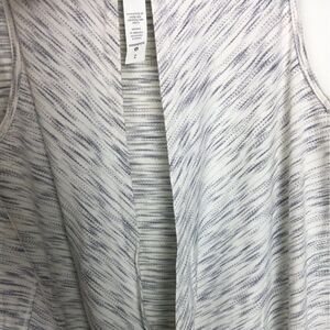 Summer top in light grey with darker grey pattern in the material. Round neck, short sleeve. Round hemline. Shorter in the front than in the back. Large opening in the back that has a drape look.