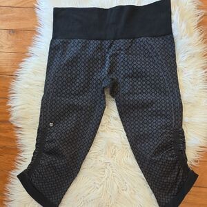 Lululemon Ebb Compression leggings. Womans size 10. Chic black & gray leggings with a stylish pattern. Perfect for workouts or casual wear. Comfortable and versatile. Some wash wear in the gusset but noting major. overall in excellent conditon. Metal button logo.