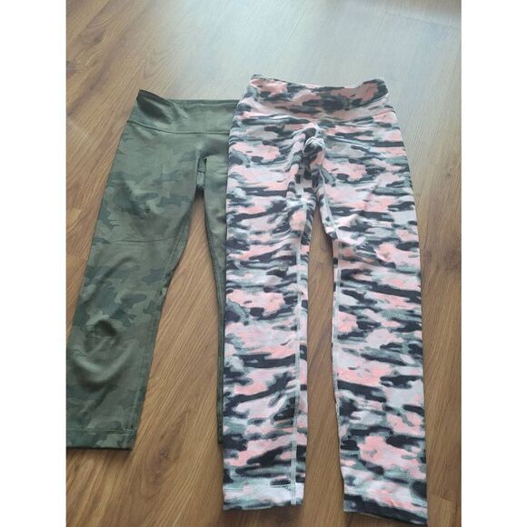Bundle of two Lululemon leggings. One is Capri length. Both have approximate measurements of length in photos. Green camo is more of a performance fabric, pink camo has more of a cotton feel. Both older styles, but in great condition with no pilling. Hang tags are removed, but size dots in place. Size 4.