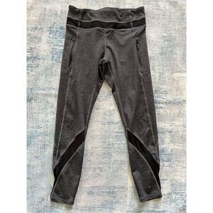 Dark heathered gray Inspire II 7/8 tights from Lululemon. Black mesh panels and accents. Vertical zipper on each front thigh. Small pockets inside waistband. Excellent condition.