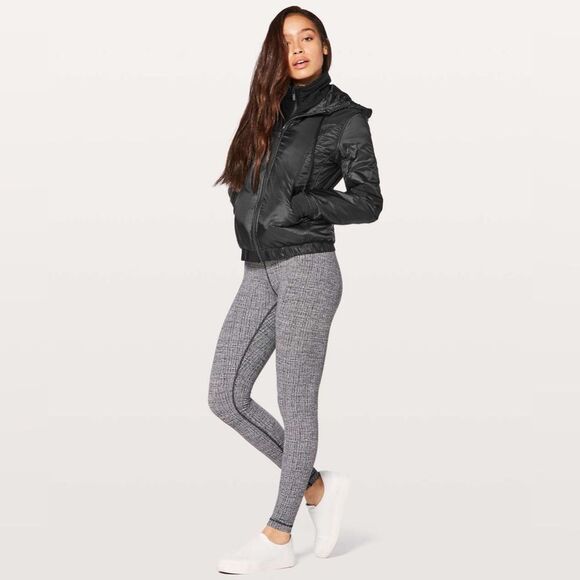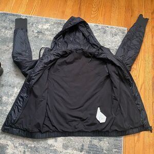 Lululemon Glyde Scuba Hoodie with Primaloft, SZ 6 but runs smaller IMO especially if layered, Black. Durable nylon outer fabric & Primaloft filling. VGUC- Missing removable fleece liner but I never even used it. Super warm and cute fully zip hoodie. Small defect to fabric on right front pocket area as pictured. Pockets, hood, thumb holes, and fabric lining. Has inner zippers if you want to purchase a replacement inner fleece lining on your own. Offers welcomed.