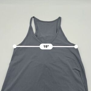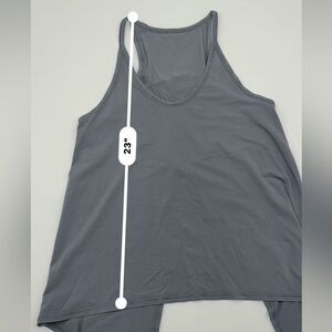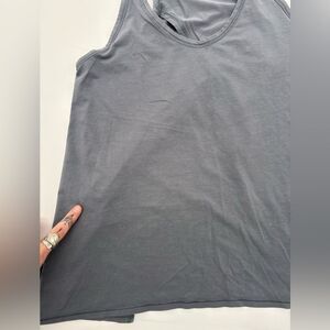 Lululemon grey open back tank. Razorback straps with a grey Lululemon symbol on the back center in grey. Open back with triangular open bottom. There are two ever so light bleach spots, they are minuscule. But had to disclose. One on the front and one on the side, pictured but even pointed out you can barely see. Only flaw.