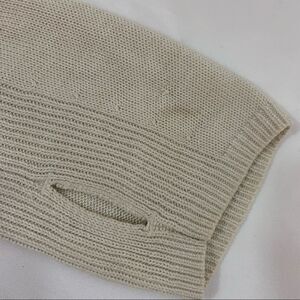 Light stain on the right sleeve, near the thumb hole. A couple of snags to the yarn also present, consistent with gentle wear. Free of holes or tears.