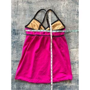 Rehearsal tank top from Lululemon. Built in shelf bra with openings for removable padded cups (not included). Crossed adjustable straps. Bright pink with gray trim. Colorway is called "Paris Pink"