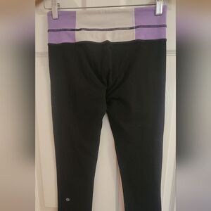 Lululemon Reversable Leggings Women's Size 6. Excellent conditon. Really soft. Cute, Lavendar, white Block print with solid black on one side. then, the reverse is solid black. Really Soft. Super cute.