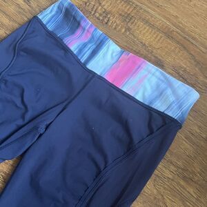 Stylish navy leggings featuring a vibrant multicolor waistband. Perfect for active wear.