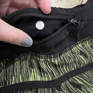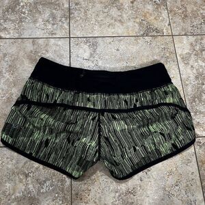 Lululemon Speed Short (2 1/2") Down Pour Lime Light / Black. Size 4. Stylish green patterned women's shorts perfect for active wear. Comfortable and trendy design.