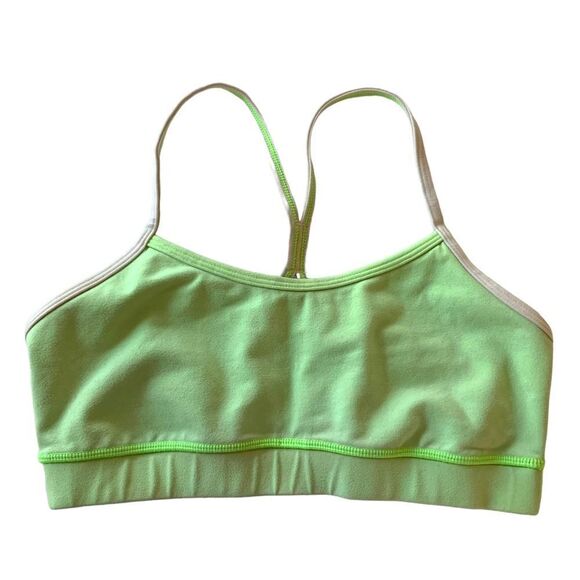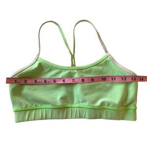 Lululemon sports bra in lime green/gray. No size found, please refer to measurements. In GUC, shows signs of wash wear.