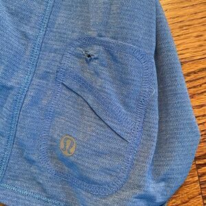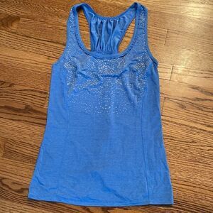 Lululemon Blue Cinch Ruffle Tank Top 4 Size Dot: 4 Blue Ruched Back w/ Reflective Tape Reflective material in front design Excellent condition!