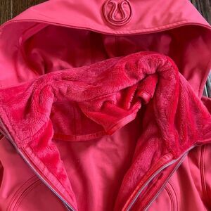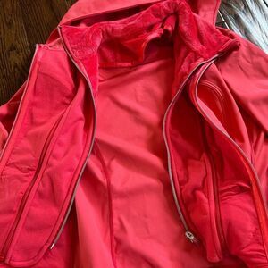 Lululemon Uba Hoodie *Softshell Love Red. Size 8. Stylish Lululemon jacket with a cozy hood. Features a full zip front and soft lining. Perfect for casual wear.