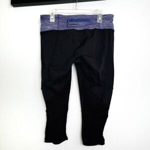 Great pair of cropped leggings by lululemon. Contrasting waistband. Elastic ruching at sides of bottom half of legs super flattering. There is slight wear to the legs as shown. Some loose threads. Overall fair used condition with tons of life left. Lying flat waist approx 14” across and inseam approx 17”. All measurements are approximate