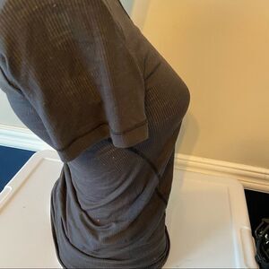 Lululemon lightweight ribbed v-neck tee. See measurements I would say size small. Bust 14” length 27”