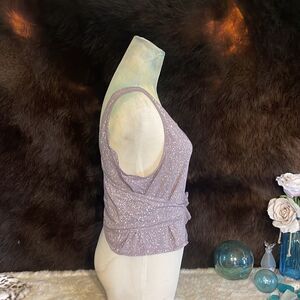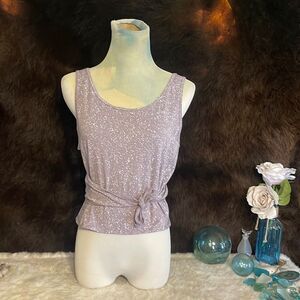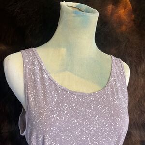 Lavender with white speckles top. The rip tag has been removed but this is a size 6. However, the top with the tie makes it adjustable so it really could fit anywhere from a four to an eight. It’s in excellent condition & slightly cropped with a total approximate length from the top of the shoulder strap 18 inches long