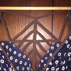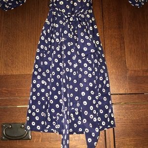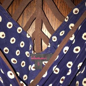 Lulumari Dress, lightweight fabric with stylish print. Slips overhead, elastic waist. Scallop skirt. Braided style back, tie around waist for add detail. This dress is really cute and very stylish. Skirt lands just above the knee. Quarter length sleeves with just a little poof. Excellent condition. No stains rips or Tears.