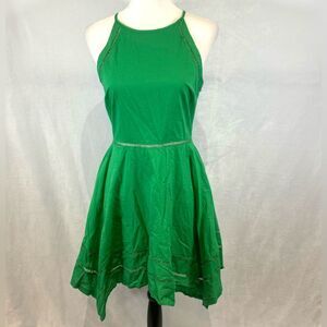 Bits of crochet detail and a fit-and-flare cut make the Lulus Catch Your Eye Green Skater Dress an eye-catching classic! Light and breezy woven cotton shapes a darted, sleeveless bodice with a high neckline, while pierced embroidery trims the neck, arm openings, and fitted waist. Flirty flaring skater skirt ends in a handkerchief hem finished with more pierced embroidery detail along the edges. Hidden back zipper/clasp. Euc