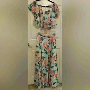 Lulu’s 2 Piece Floral Fairy Ethereal Maxi skirt off the shoulder top Large L