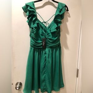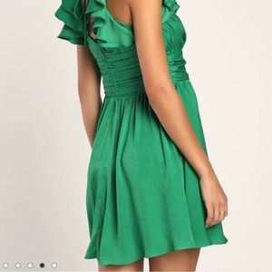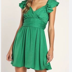 The Lulus Daytime Darling Green Ruffled Mini Dress will have you looking sweet as can be! Satiny woven fabric shapes this dress that has ruffled short sleeves, a surplice neckline, and light gathering at the bust. A banded waist top a twirly skater mini skirt. A slender tie at the back completes the look. Hidden back zipper/clasp.